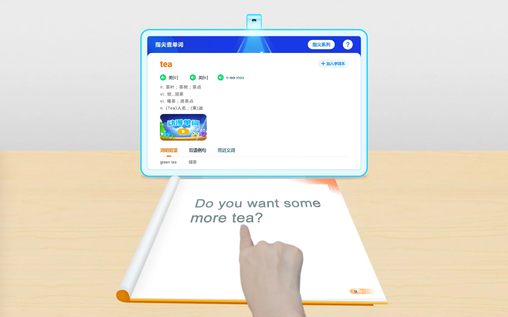 实时动态检测并识别用户手指所指的单词、汉字、拼音,输出对应生字词释义与语音,帮助孩子认识生字词,减轻家长辅导负担,支持任意纸质书本文字识别